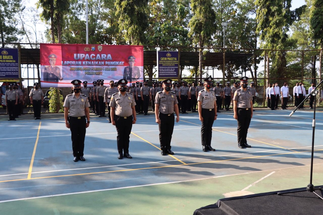 Sebanyak 60 anggota Polres Batu mendapatkan anugerah kenaikan pangkat setingkat lebih tinggi, pemberian kenaikan pangkat bertepatan dengan HUT Bhayangkara ke-76 yang jatuh pada 1 Juli 2022. Upacara kenaikan pangkat anggota Polri Tmt 1 Juli 2022 dipimpin Wakapolres Batu Kompol Iswahab yang dilaksanakan di Lapangan Olahraga Polres Batu, Jum’at (1/7/2022). Anggota Polres Batu mendapatkan kenaikan pangkat setingkat lebih tinggi dari Aipda ke Aiptu sebanyak 1 personel, Bripka ke Aipda 16 personel, Brigadir ke Bripka 2 personel, Briptu ke Brigadir 1 personel dan Bripda ke Briptu 40 personel. Kapolres Batu AKBP I Nyoman Yogi Hermawan melalui Wakapolres Batu Kompol Iswahab menyampaikan bahwa,…