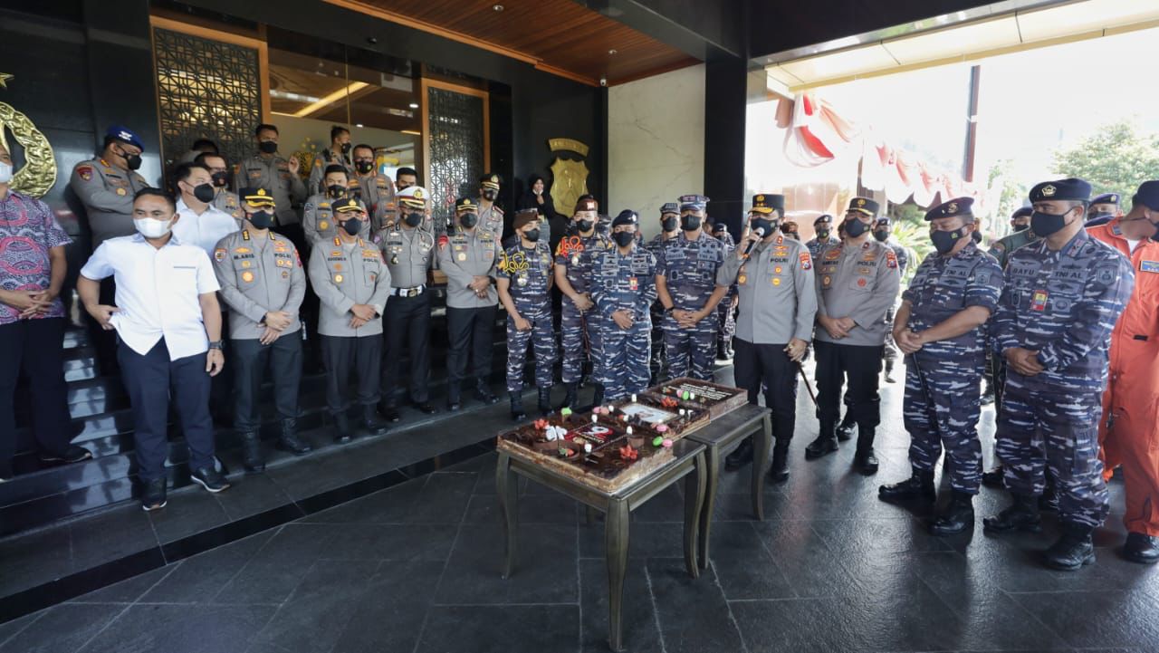 Polres Batu – Puluhan anggota TNI dari Korem 083 Baladhika Jaya Malang dan Kodim 0818 Malang-Batu mendatangi Mapolres Batu yang berada di jalan AP III Katjoeng Permadi, Desa Junrejo, Kecamatan Junrejo, Kota Batu, Jum’at (1/7/2022). Mereka mendatangi lokasi sekitar pukul 08.00 WIB dengan membawa tumpeng serta kue ulang tahun bertuliskan Hari Bhayangkara ke-76. Doa dan makan bersama menjadi isi acara tersebut. Kejutan itu sebagai bentuk sinergi TNI-Polri demi meningkatkan pelayanan serta menjamin keamanan bangsa dan negara, ini sesuai tema hari jadi Bhayangkara ke-76 “Polri yang presisi mendukung pemulihan ekonomi dan reformasi struktural untuk mewujudkan Indonesia tangguh – Indonesia tumbuh”. Kasirem…