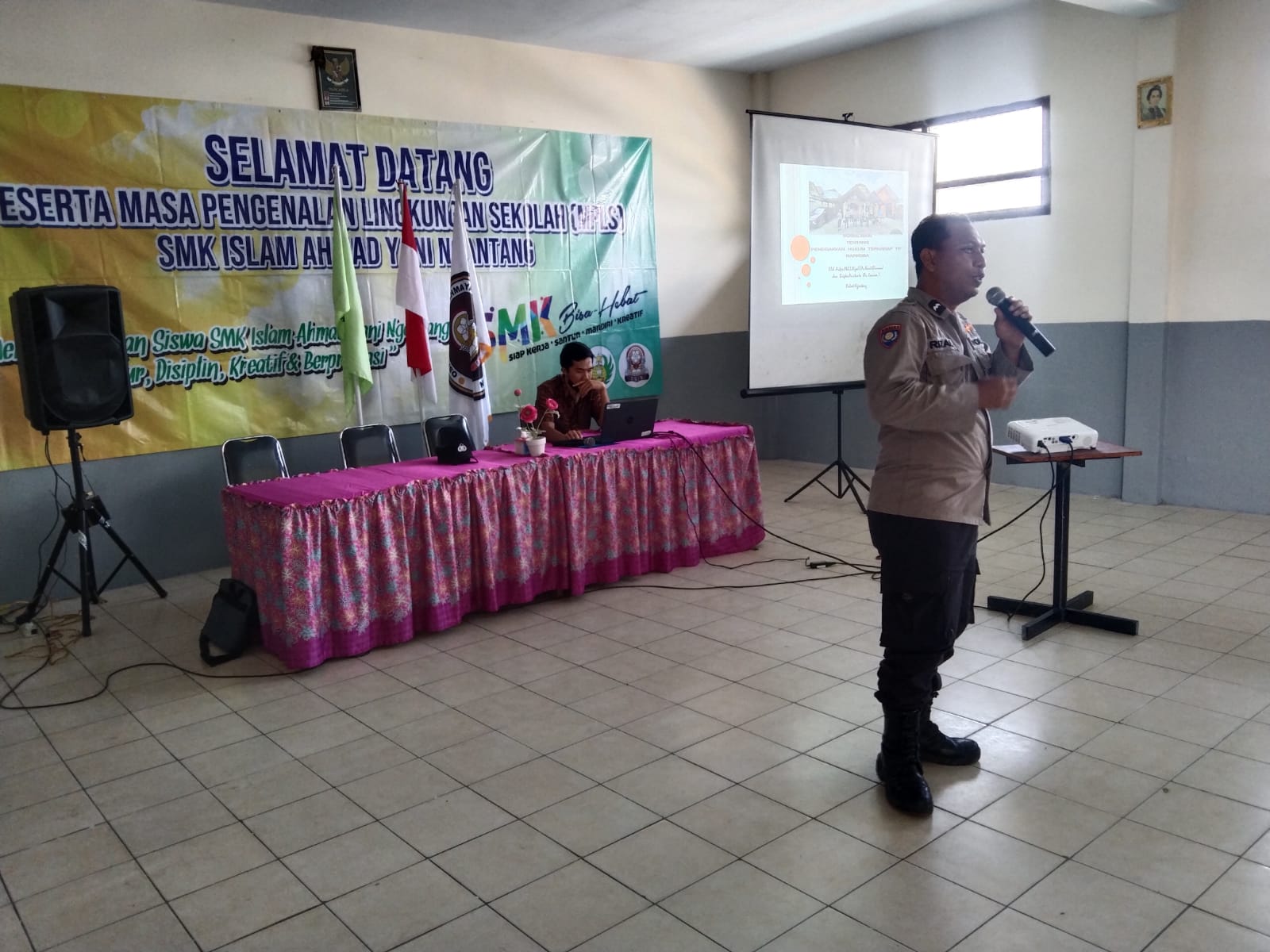 Polres Batu – Di Masa Pengenalan Lingkungan Sekolah (MPLS) untuk siswa baru perlu pembekalan wawasan dan penyuluhan tentang bahaya Narkoba dan berdisiplin berlalu lintas. Seperti yang dilakukan KSPKT bersama Kanit Binmas Polsek Ngantang Polres Batu yang melaksanakan Pembinaan dan Penyuluhan (Binluh) tentang Narkoba dan tata cara tertib berlalu lintas kepada pelajar SMK Ahmad Yani Ngantang, Kabupaten Malang, Jum’at (15/7/2022). Kapolres Batu AKBP Oskar Syamsuddin melalui Kapolsek Ngantang AKP Hanis Siswanto membenarkan bahwa anggota Polsek Ngantang memberikan penyuluhan bahaya Narkoba, dan disiplin berlalu lintas, hal ini dilakukan untuk mengenalkan aturan dan tata cara tertib berlalu lintas Lantas kepada siswa pada MPLS….