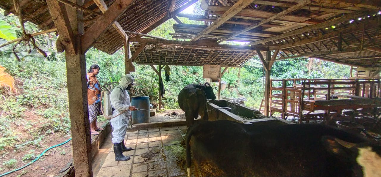 Redam PMK, Bhabinkamtibmas Wonoagung Kasembon Lakukan Penyemprotan Disinfektan di Kandang Milik Warga