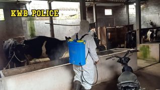 Polres Batu – Polsek Pujon laksanakan giat penyemprotan disinfektan sebagai antisipasi penyebaran Penyakit Mulut dan Kuku (PMK) pada kandang ternak milik Bapak Sholeh di Dusun Lebaksari Desa Ngroto, Kecamatan Pujon, Kabupaten Malang, Selasa (19/7/2022).