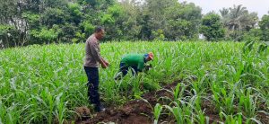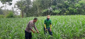 Dalam kunjungannya, Aipda Dul Didit meninjau kondisi tanaman jagung yang tengah memasuki masa pertumbuhan subur di lahan milik Bapak Suparman.