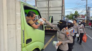 Polresta Banyuwangi Berbagi Mamiri Kepada Pengguna Jalan yang Terjebak Kepadatan Pelabuhan Ketapang