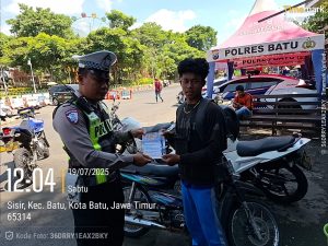 Kota Batu – Dalam rangka meningkatkan kesadaran masyarakat akan pentingnya tertib berlalu lintas, personel Satuan Lalu Lintas (Satlantas) Polres Batu melaksanakan kegiatan pembinaan dan penyuluhan (Binluh) serta pembagian brosur kepada pengguna jalan di kawasan Jalan Gajah Mada, Kelurahan Sisir, Kecamatan Batu, Kota Batu, Sabtu (19/07/2025).