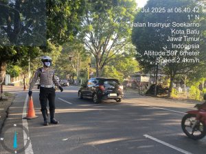 Batu – Guna mendukung kelancaran arus lalu lintas serta memberikan rasa aman bagi masyarakat, anggota Satuan Lalu Lintas (Satlantas) Polres Batu rutin melaksanakan kegiatan pengaturan lalu lintas pagi dan membantu penyebrangan masyarakat di sejumlah titik rawan kemacetan dan lokasi padat aktivitas, Senin (21/07/2025).