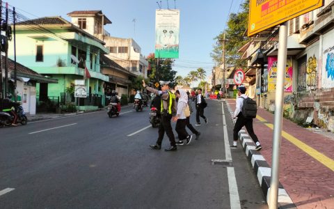 Satlantas Polres Batu Edukasi Tertib Lalu Lintas Lewat Leaflet, Stiker, dan Penyeberangan Siswa Sekolah
