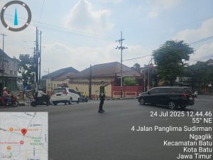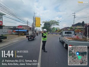 Kota Batu – Guna menciptakan situasi lalu lintas yang aman, tertib, dan lancar, serta meminimalisir potensi kecelakaan lalu lintas di jam-jam rawan, personel Satuan Lalu Lintas (Satlantas) Polres Batu melaksanakan kegiatan pengaturan arus kendaraan pada siang hari di sejumlah titik padat di wilayah Kecamatan Batu, Kota Batu, Kamis (24/07/2025).