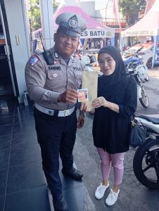 Salah satu bentuk konkret kegiatan tersebut adalah melalui aksi pembagian leaflet, penempelan stiker himbauan tertib berlalu lintas, serta pengamanan dan pelayanan penyeberangan siswa sekolah di wilayah Kecamatan Batu, Kota Batu, Kamis (24/07/2025).