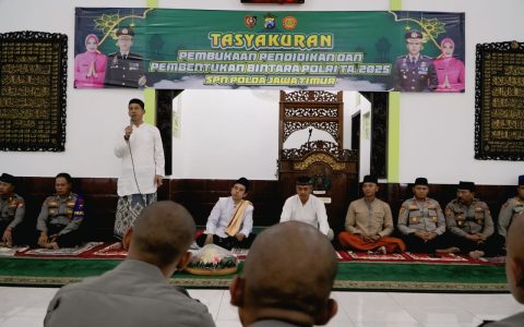 MOJOKERTO – Usai seharian penuh menjalani serangkaian penerimaan, 247 calon siswa Pendidikan Pembentukan Bintara (Diktukba) Polri tahun anggaran 2025 di Sekolah Polisi Negara (SPN) Polda Jawa Timur melanjutkan dengan kegiatan syukuran dan doa lintas agama. Acara ini berlangsung pada Minggu (27/7/2025) pukul 17.30 WIB, serentak di Tiga tempat ibadah di lingkungan kesatrian SPN Polda Jatim. Calon siswa beragama Islam melaksanakan ibadah di Masjid Al Muttaqin, sementara calon siswa Nasrani melaksanakan ibadah di Gereja Oikumene, dan yang beragama Hindu melakukan doa di Pura Bala Widya Mandira. Kegiatan tersebut dihadiri langsung oleh Kepala SPN Polda Jatim Kombes Pol Agus Wibowo, S.I.K., didampingi…
