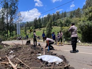 PROBOLINGGO,- Aksi cepat tanggap ditunjukkan personel Polsek Sukapura Polres Probolinggo dalam menangani bencana tanah longsor yang menutup jalur menuju wisata Gunung Bromo, Kabupaten Probolinggo, pada Rabu (1/10/2025).