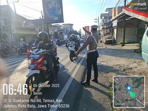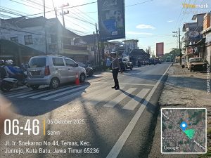Batu – Dalam rangka memberikan pelayanan terbaik kepada masyarakat serta menjamin keselamatan dan kelancaran lalu lintas di wilayah hukumnya, anggota Satuan Lalu Lintas (Satlantas) Polres Batu melaksanakan kegiatan rutin pengaturan arus lalu lintas dan penyebrangan di sejumlah titik rawan kemacetan dan lokasi aktivitas masyarakat, Senin (06/10/2025).