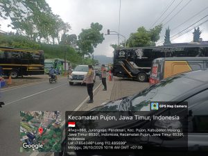 Batu, Malang – Menyikapi tingginya kunjungan wisatawan di akhir pekan, Personel Polsek Pujon Polres Batu secara proaktif melaksanakan kegiatan pengamanan dan pengaturan lalu lintas di kawasan wisata Santerra De Laponte, Jalan Abd. Manan Wijaya, Desa Pandesari, Kecamatan Pujon, Kabupaten Malang, Minggu (26/10/2025).