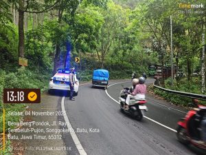 Kota Batu – Personel Satuan Lalu Lintas (Satlantas) Polres Batu melaksanakan kegiatan patroli dan pemantauan situasi di kawasan rawan bencana, khususnya di Jalan Trunojoyo, Kelurahan Songgokerto, Kecamatan Batu, Kota Batu, Selasa (04/11/2025).
