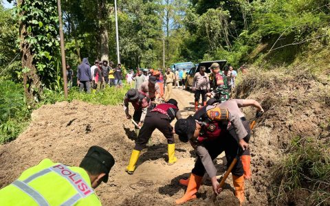 Batu, Malang – Personel gabungan dari Polres Batu, Polsek Ngantang, Koramil Ngantang, serta instansi terkait turun langsung ke lapangan melaksanakan kegiatan pengamanan dan pembersihan material tanah longsor yang terjadi di Desa Sidodadi, Kecamatan Ngantang, Kabupaten Malang, Senin (03/11/2025). Kegiatan ini dilakukan sebagai bentuk respons cepat aparat keamanan dan pemerintah daerah dalam menanggulangi bencana alam yang berpotensi mengganggu keselamatan masyarakat dan kelancaran arus lalu lintas di wilayah tersebut. Tanah longsor yang terjadi akibat curah hujan tinggi pada malam sebelumnya sempat menutupi sebagian badan jalan dan menghambat aktifitas warga serta pengguna jalan yang melintas. Kapolres Batu AKBP Andi Yudha Pranata, S.H., S.I.K., M.Si….