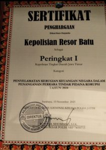 “Prestasi tersebut sekaligus menegaskan bahwa jajaran Polres Batu tidak hanya fokus pada penegakan hukum pidana umum, tetapi juga berperan aktif dalam mendukung tata kelola pemerintahan yang bersih dan akuntabel,” tegasnya.