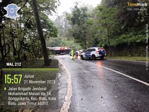 Kota Batu – Dalam rangkaian Operasi Zebra Semeru 2025, personel Satuan Lalu Lintas (Satlantas) Polres Batu menunjukkan peran vitalnya dengan melaksanakan pengaturan dan pengamanan lalu lintas di lokasi tebing longsor, Jalan Trunojoyo (Kawasan Payung II), Kelurahan Songgokerto, Kecamatan Batu, Kota Batu, Jum’at (21/11/2025).